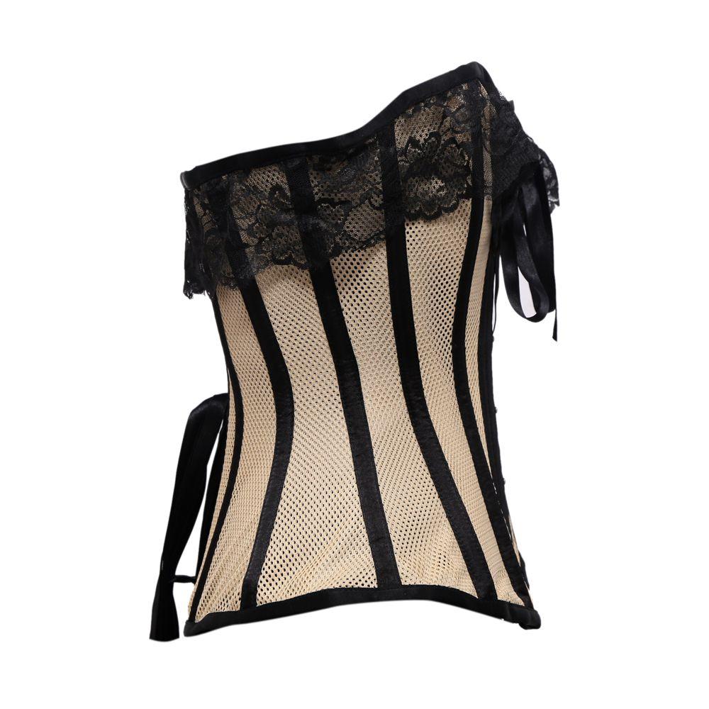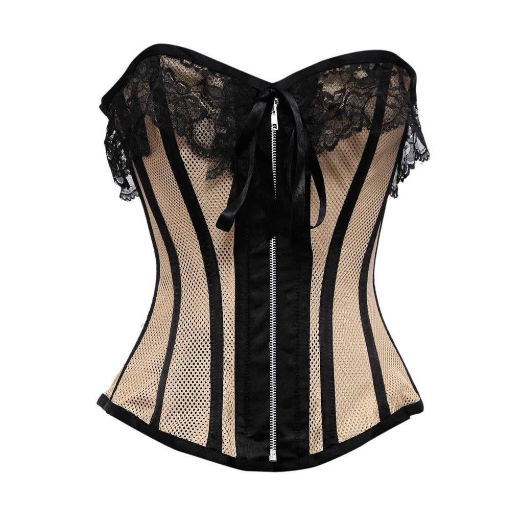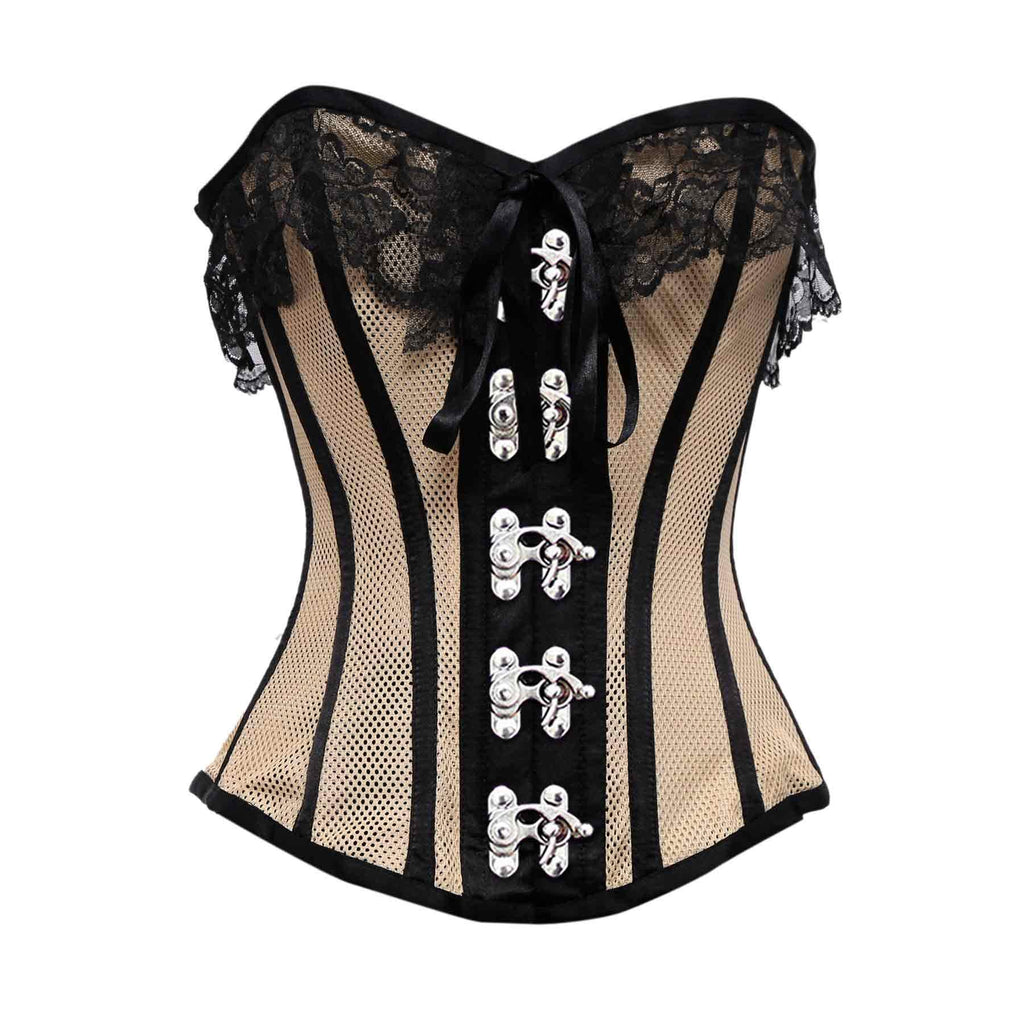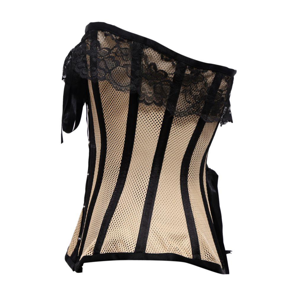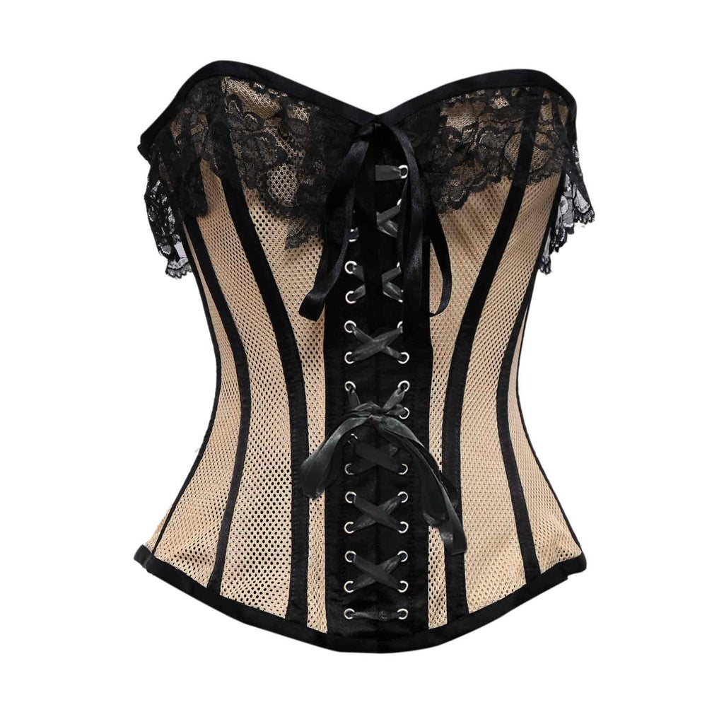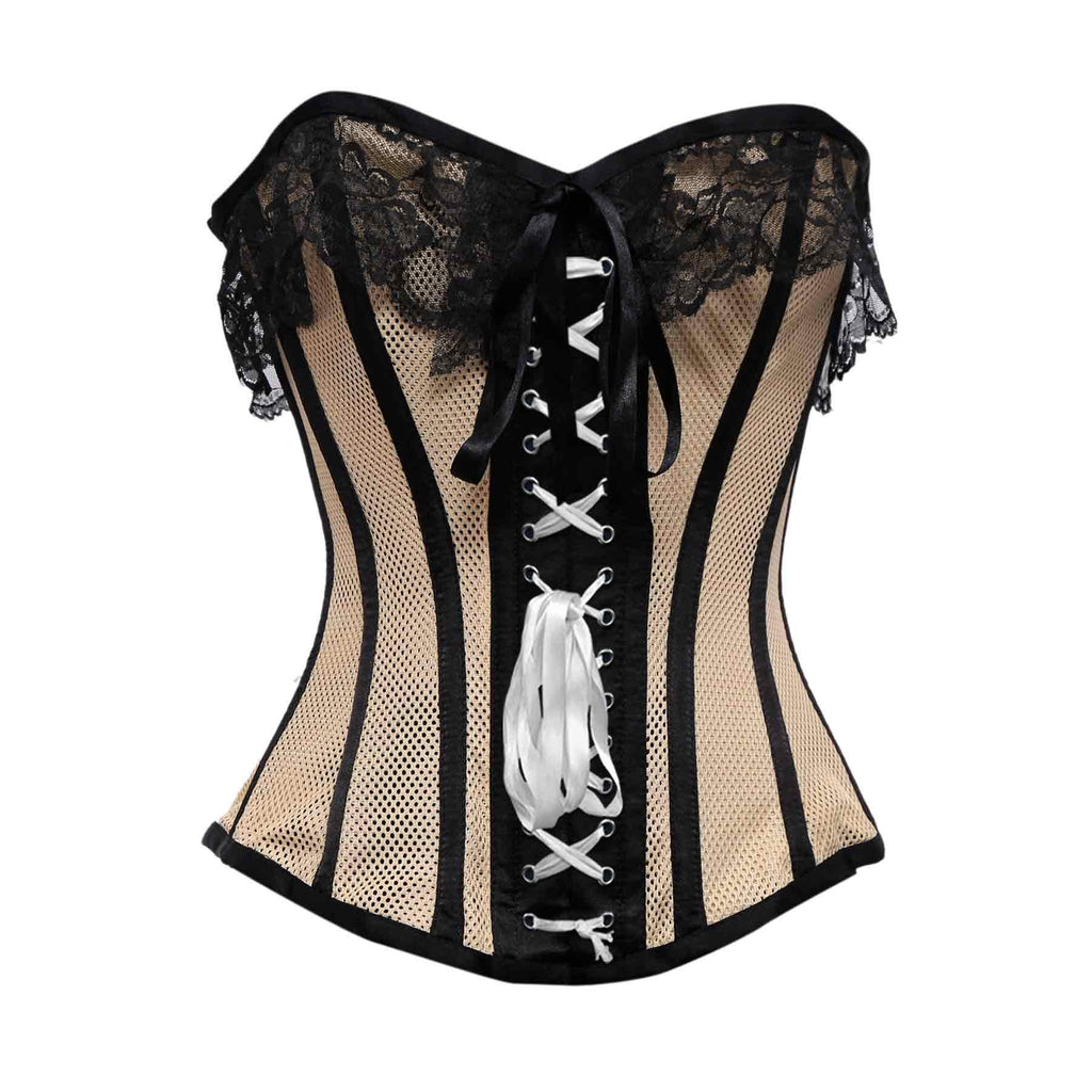 Beige Mesh Black Satin Lace Steel Boned Overbust Corset