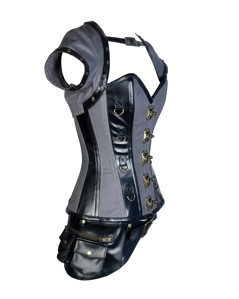 - Silver Taffeta & Black Faux Leather Overbust Corset